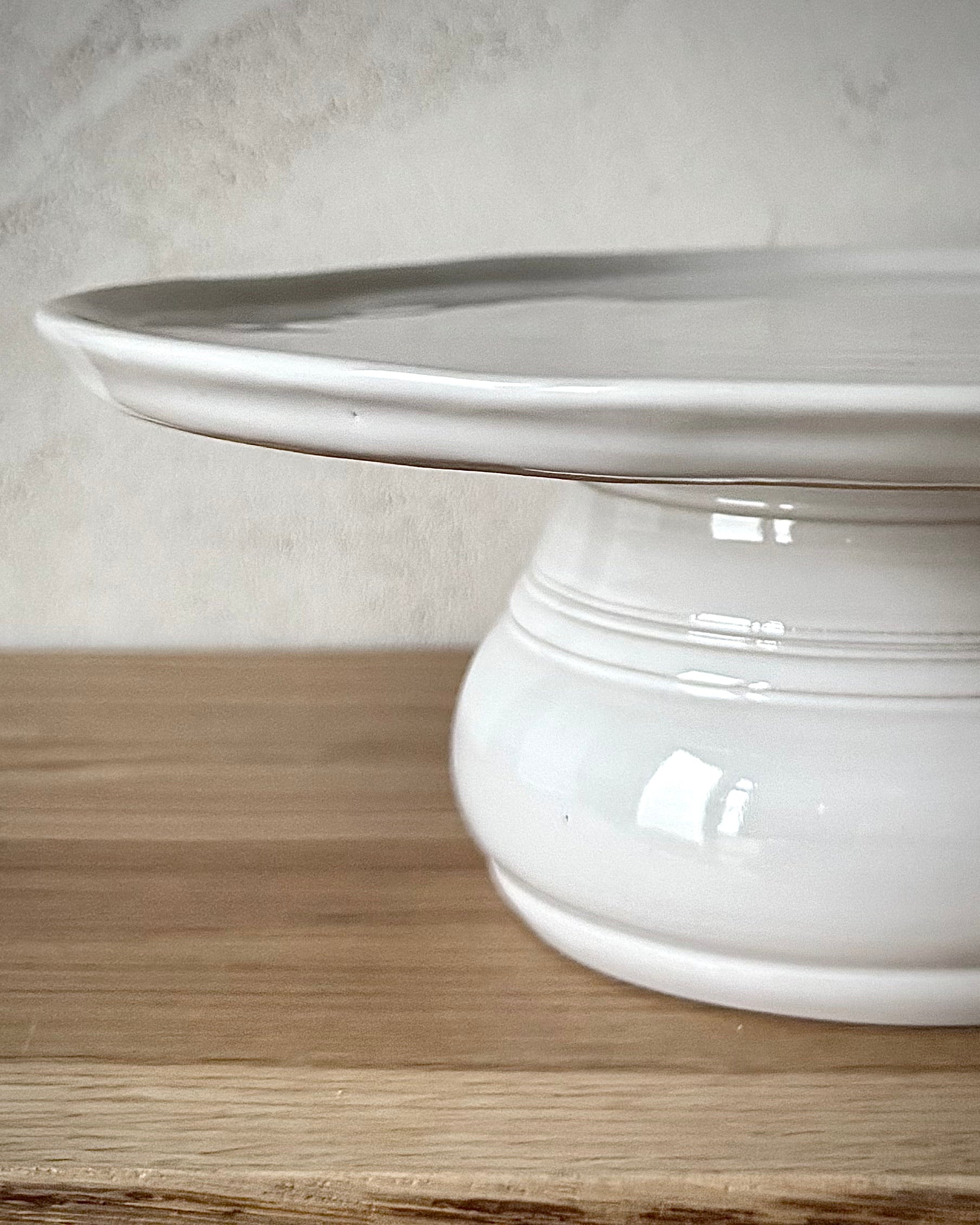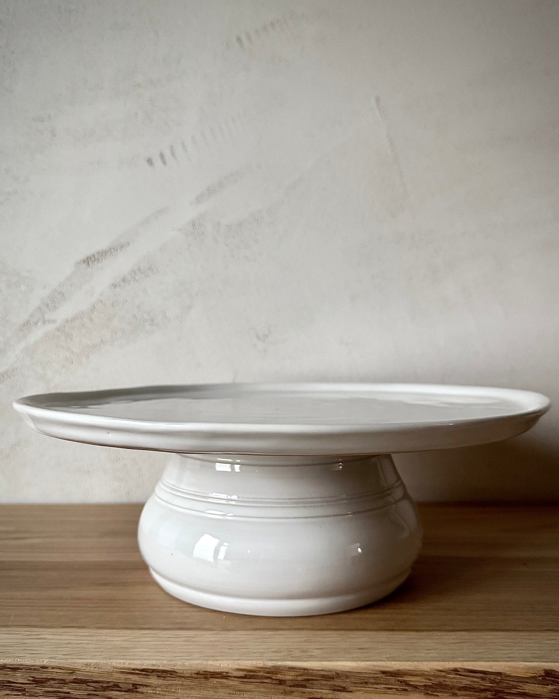 Handrenndur diskur á fæti úr hvítum steinleir með hvítum glerungi.