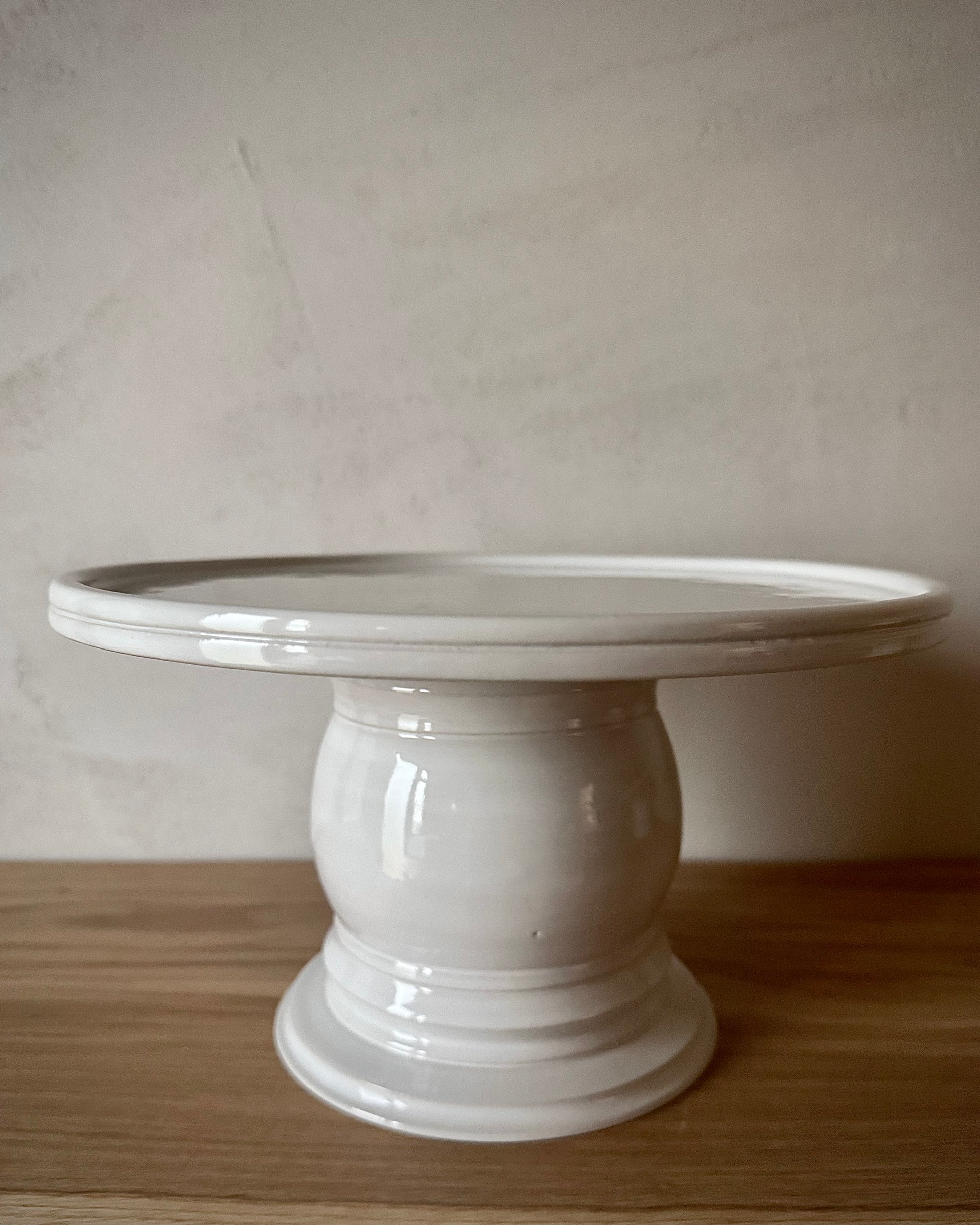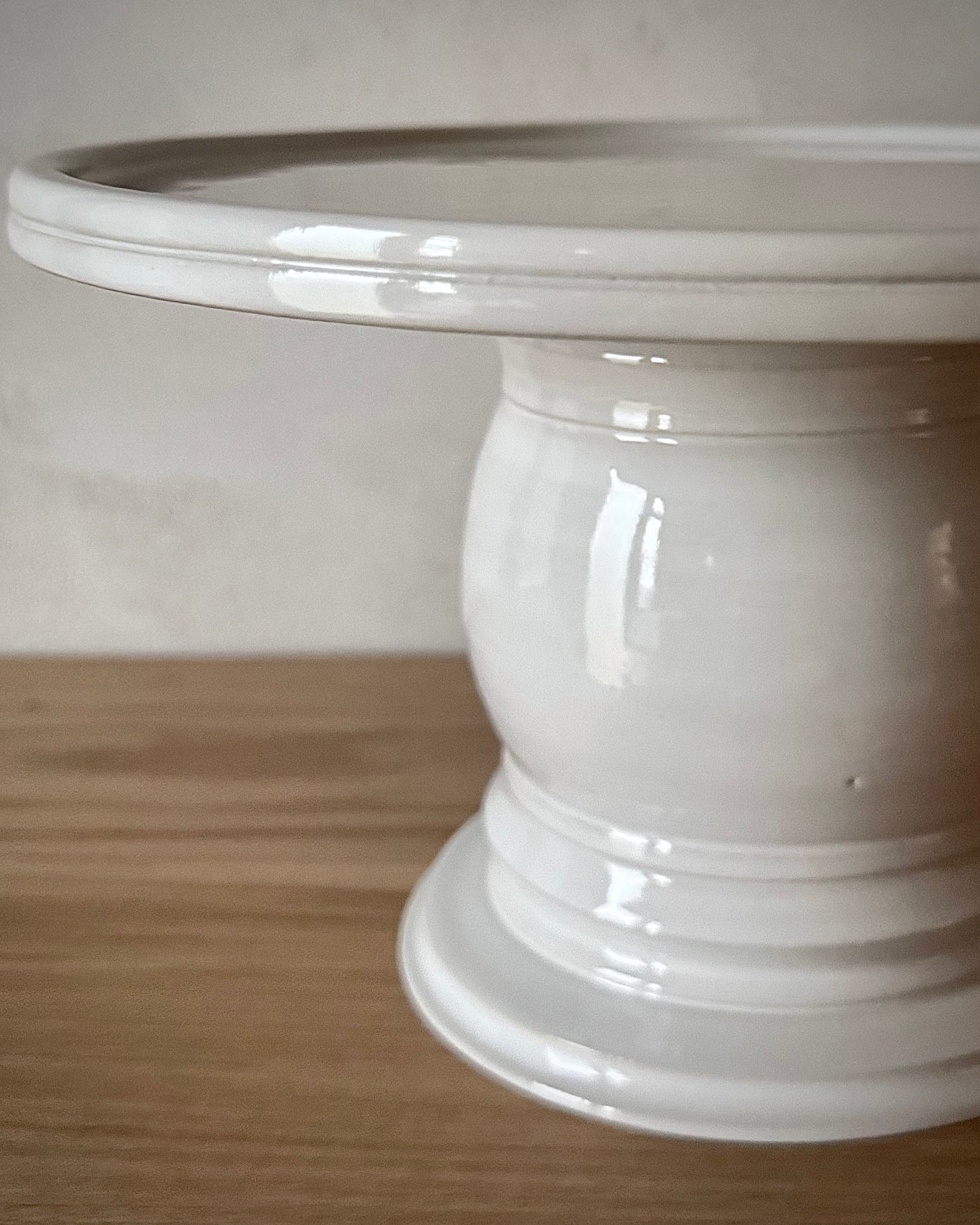 Handrenndur diskur á fæti úr hvítum steinleir með hvítum glerungi.