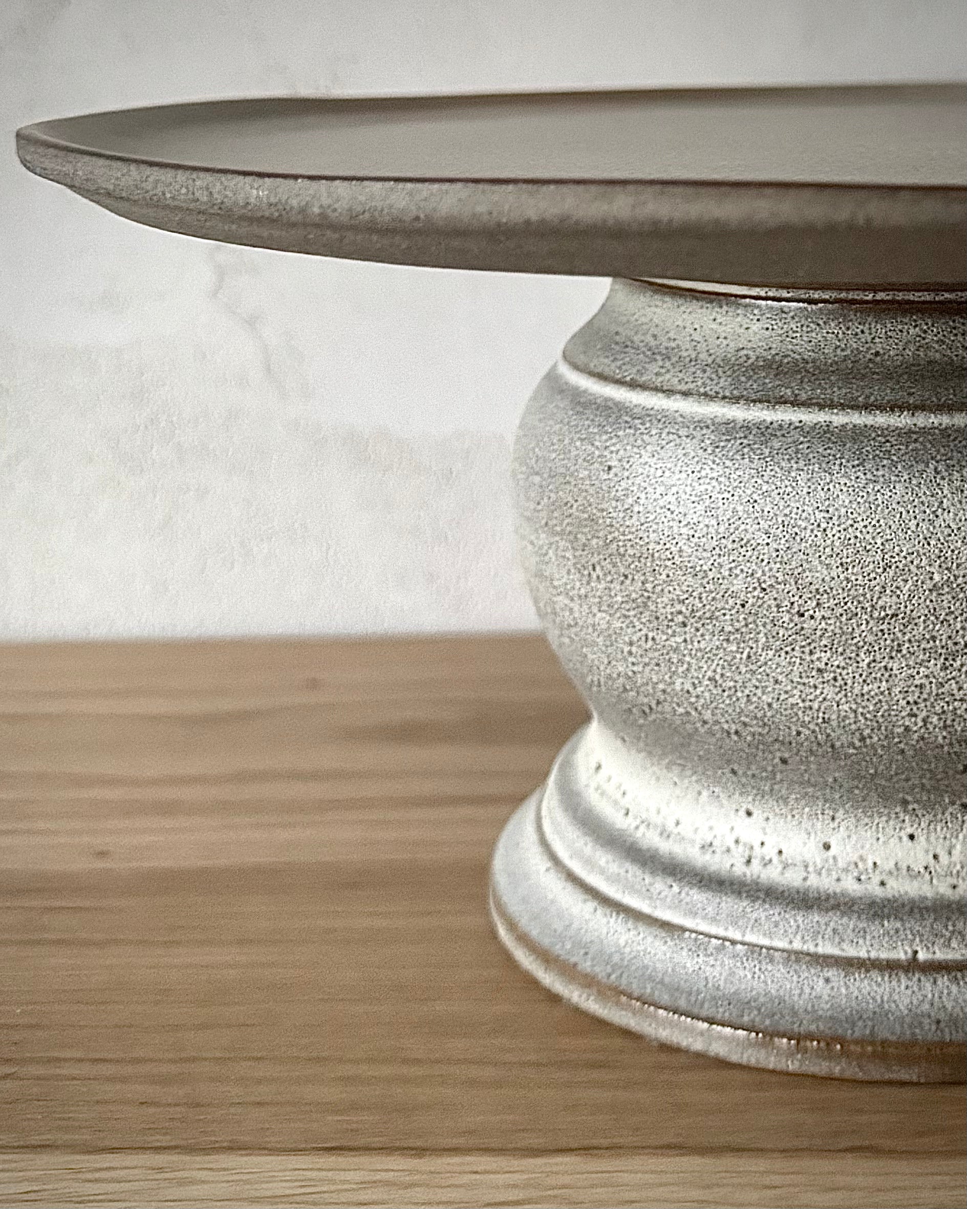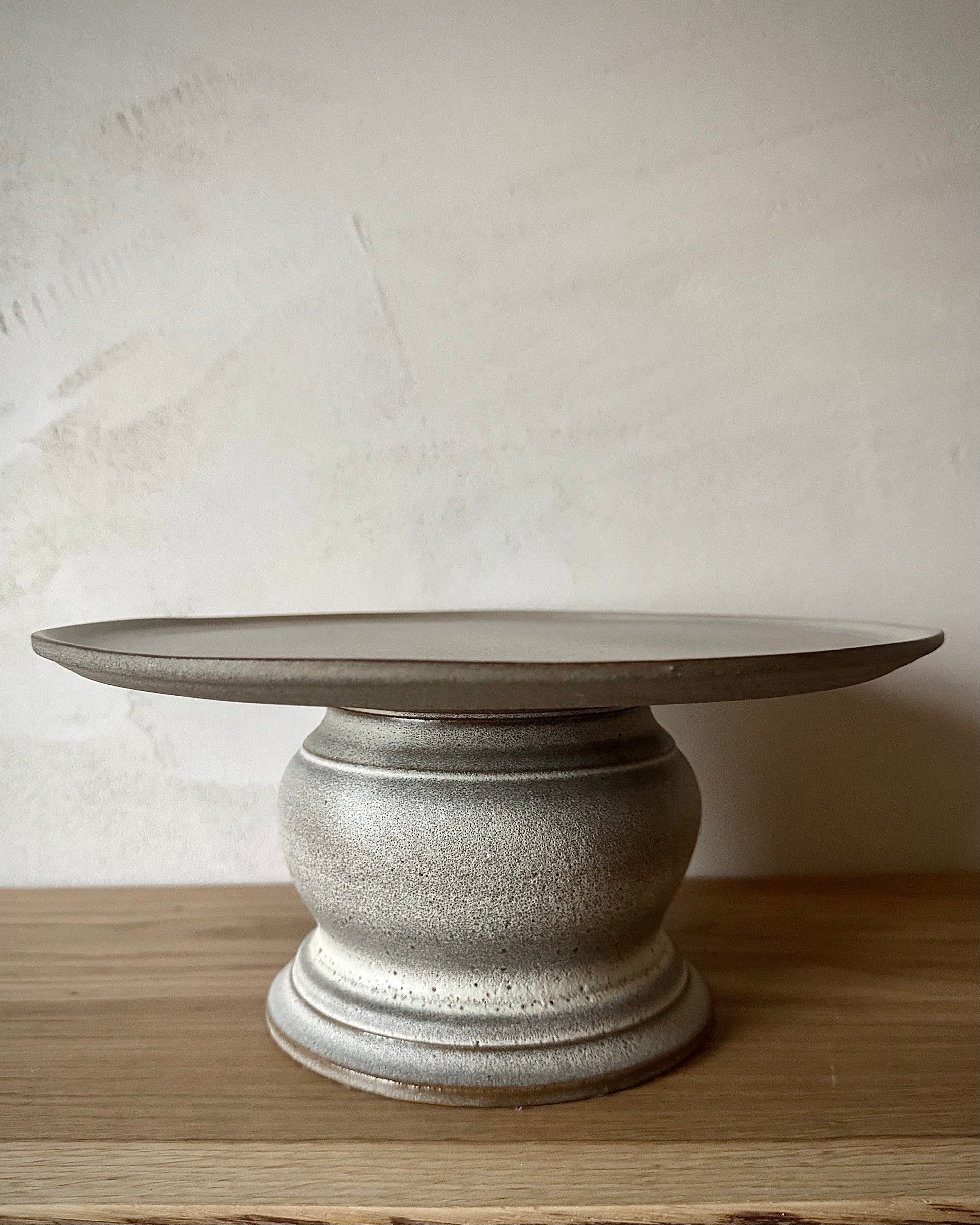 Handrenndur diskur á fæti úr gráum steinleir með brún/dröppuðum glerungi.