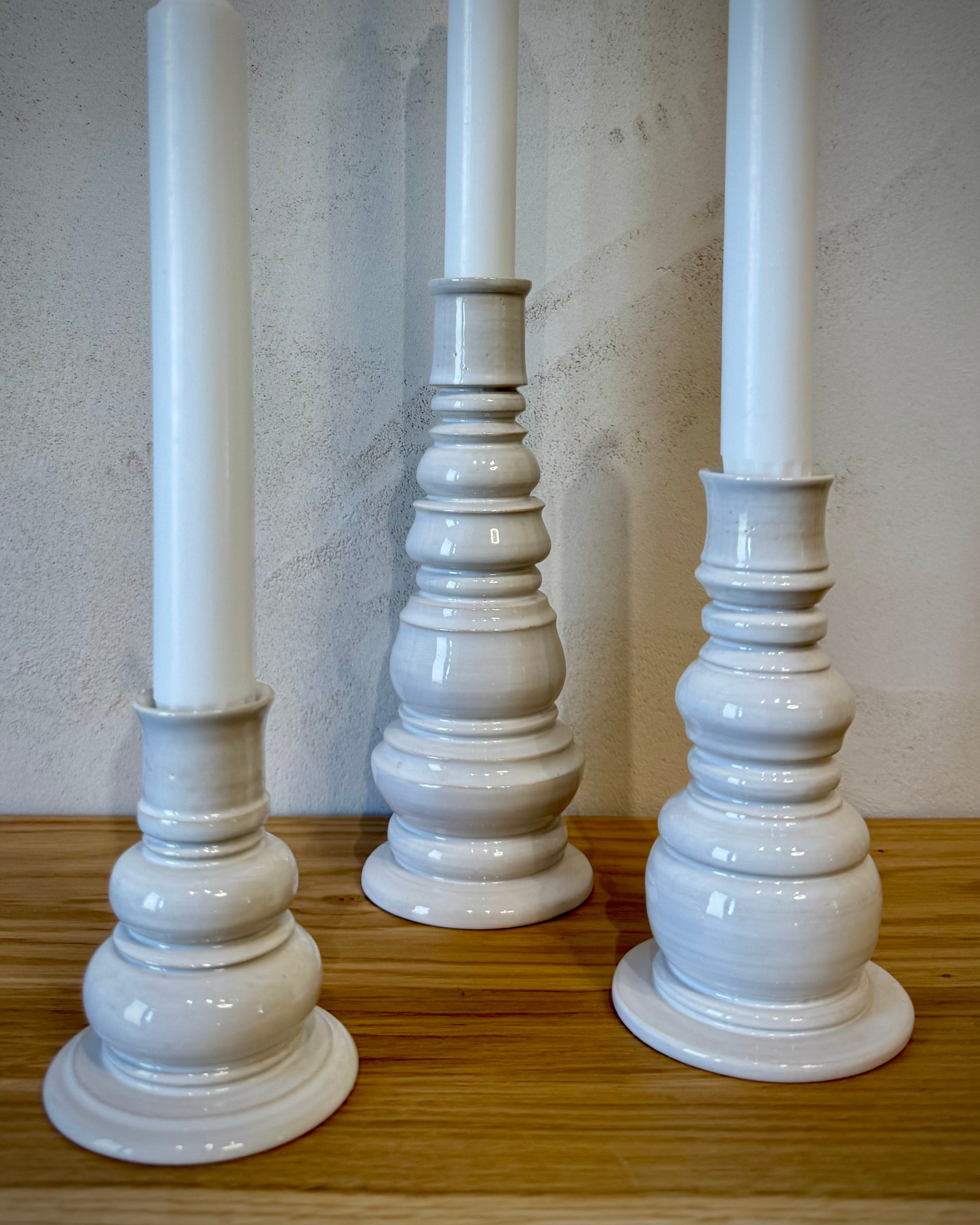 Handrenndur kertastjaki úr hvítum steinleir með hvítum glerungi.