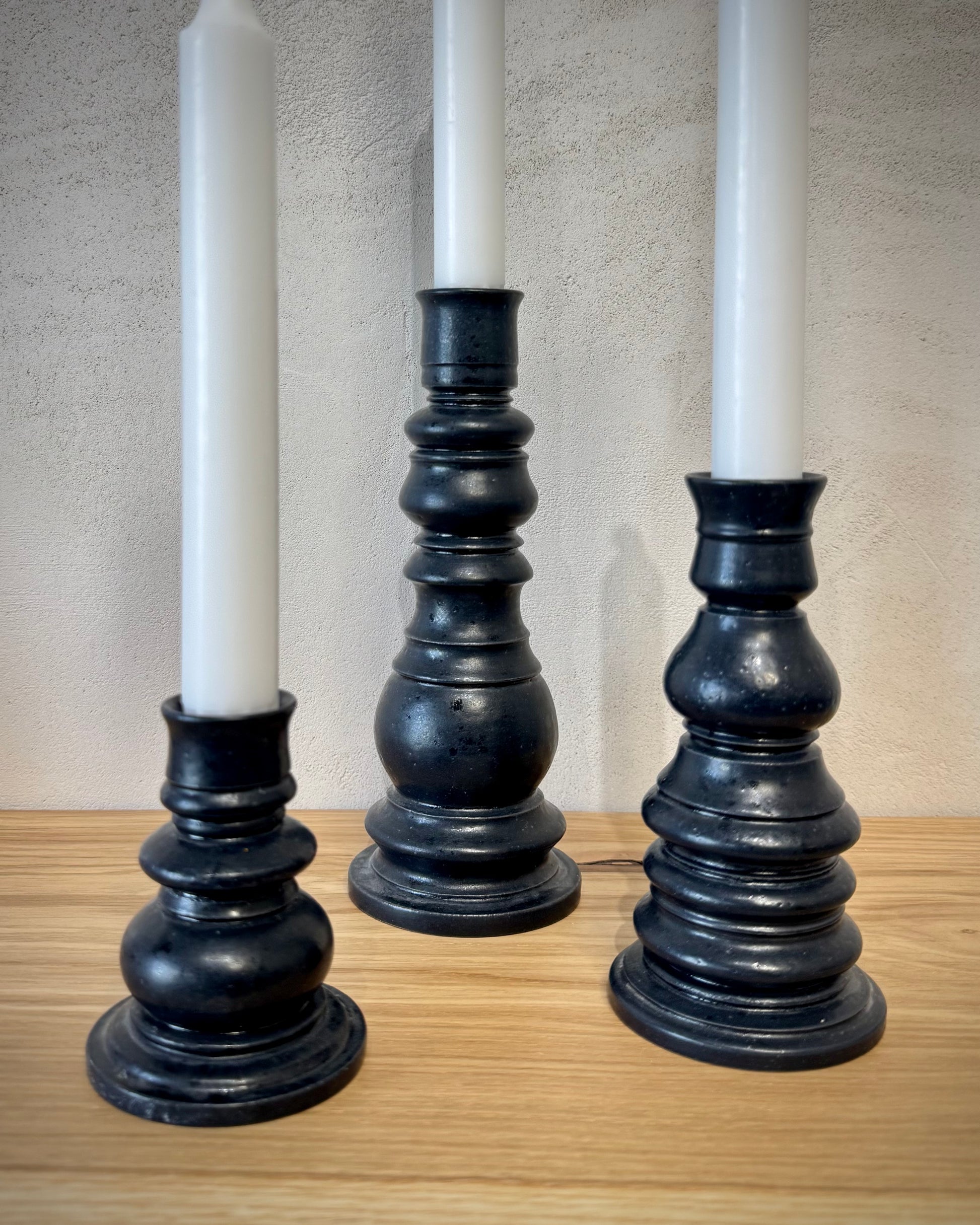Handrenndur kertastjaki úr gráum steinleir með svörtum glerungi.