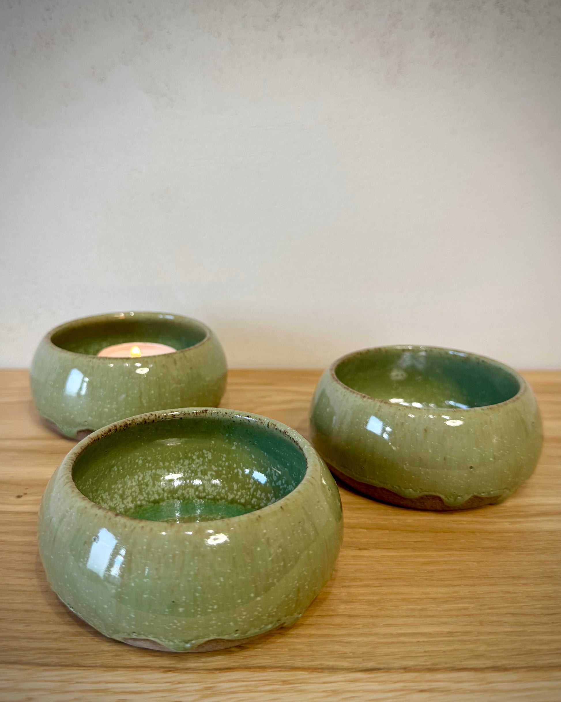 Handrenndur kertastjaki fyrir sprittkerti úr gráum steinleir með grænum glerungi.